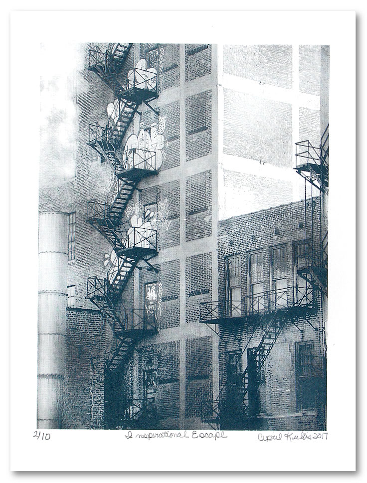 I have always been intrigued by fire escapes. Where they go, where they come from, how they make a connection to each space they pass by, and what that might mean to the occupants behind those walls. On a visit to Detroit I came across this fire escape and it inspired me. It was in an area of obvious urban decline yet its beauty was unmistakable. I snapped a picture and continued on. When I returned home I felt the need to make this into something that could be shared to inspire others as it did me.