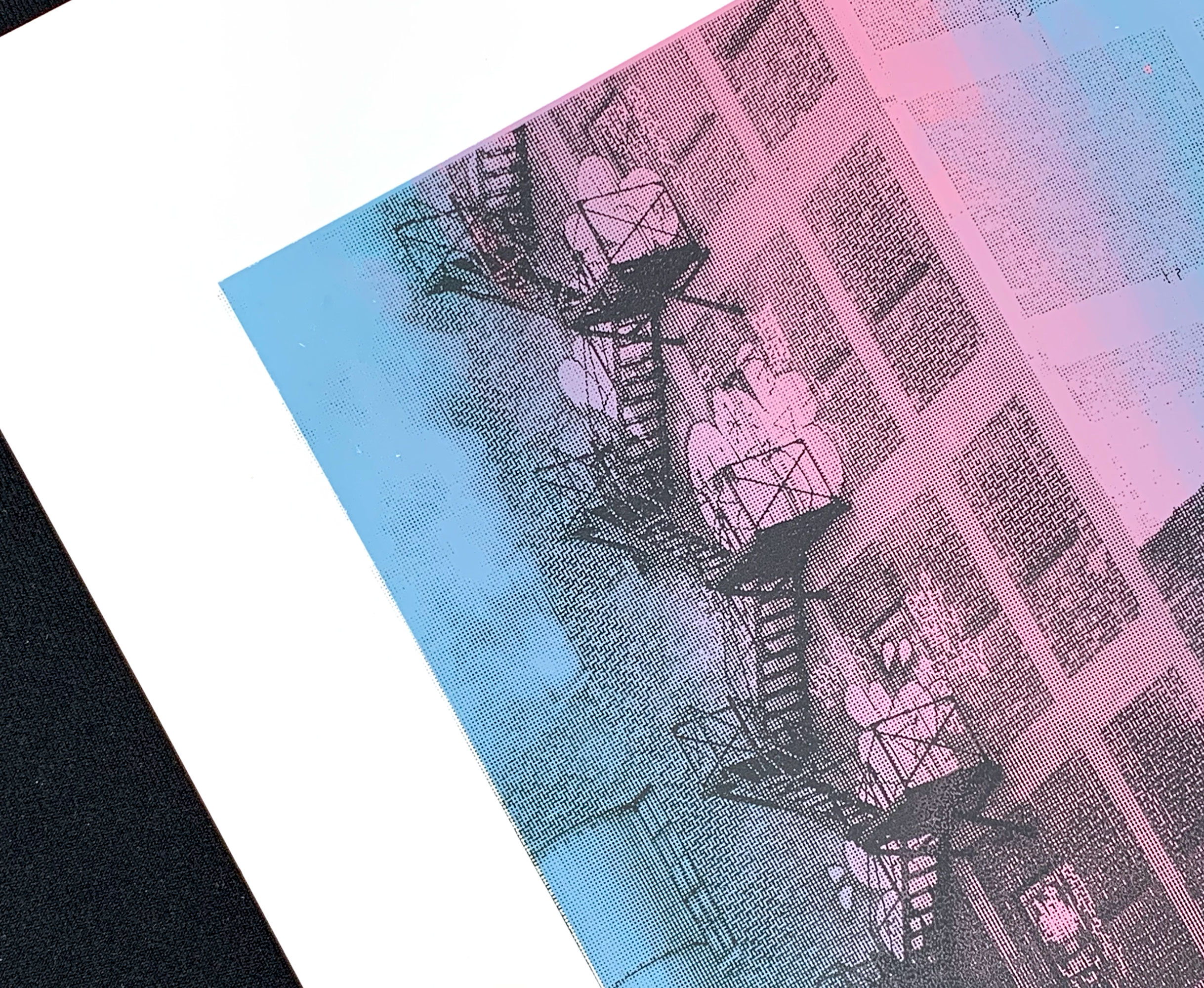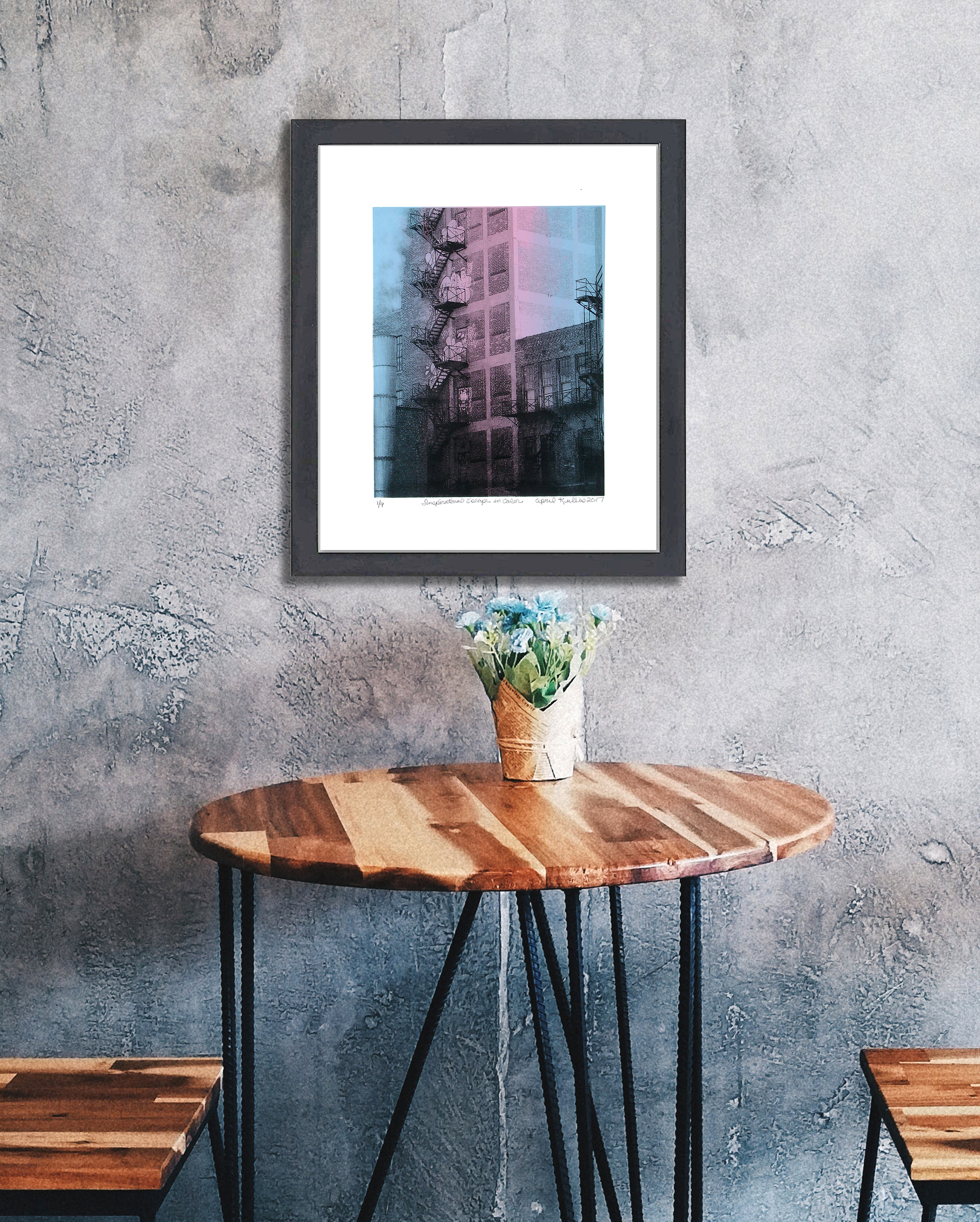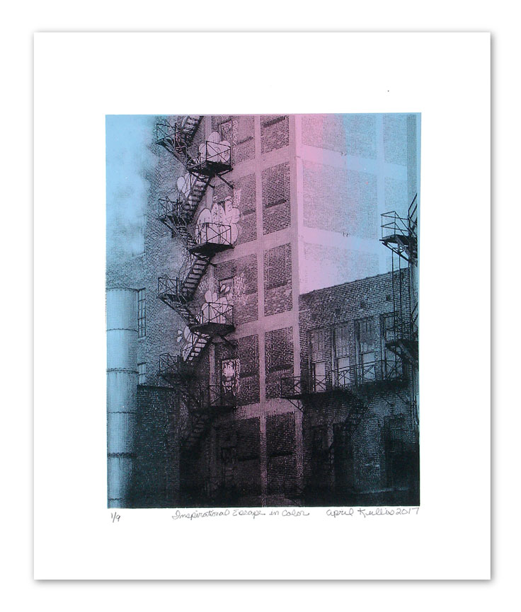 There are two versions of this print. One in black and white and one with color. I have always been intrigued by fire escapes. Where they go, where they come from, how they make a connection to each space they pass by, and what that might mean to the occupants behind those walls. On a visit to Detroit I came across this fire escape and it inspired me. It was in an area of obvious urban decline yet its beauty was unmistakable. I snapped a picture and continued on. When I returned home I felt the need to make this into something that could be shared to inspire others as it did me. I liked the first print so much I experimented with it a little more and this second print was born.