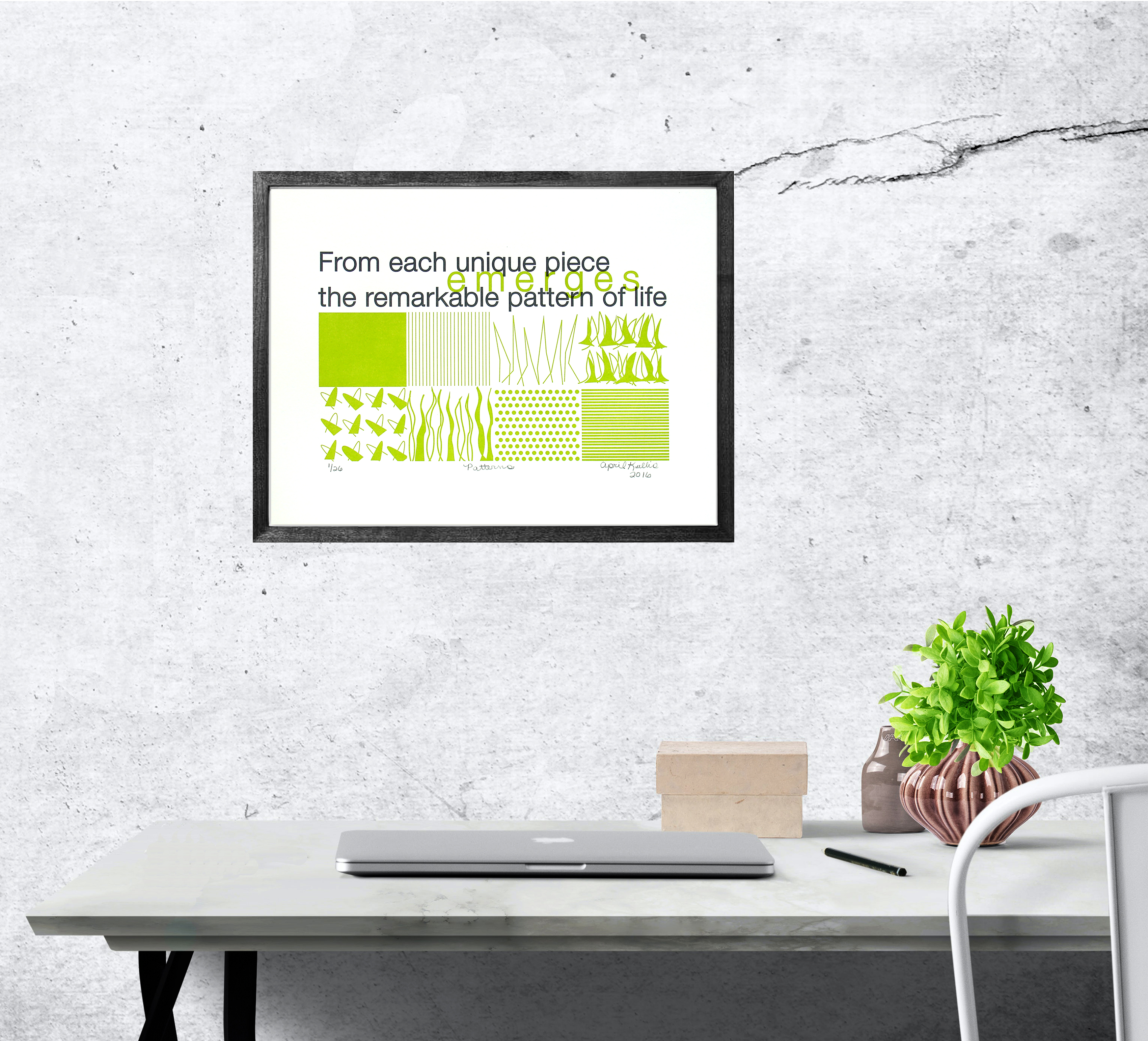 Inspired by a farmers garden viewed from the air and how that pattern relates to the world. Zoom out and you have a wonderful abstract pattern. Stand in the middle of the garden and you discover the worth of each individual plant and how different yet connected they are. Each single plant connected by the earth and dependent on the forces of nature. A perfect microcosm of life and all its complexities.
